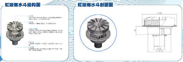 由斗體、導(dǎo)流罩、出水短管、連接壓板和整流器等組成。導(dǎo)流罩是用來攔截樹葉等固體雜物的雨水斗部件,兼有整流作用;整流器是虹吸雨水斗的重要部件,用來疏導(dǎo)水流、 消減旋流和減少空氣進(jìn)入 雨水斗出水短管;虹吸雨水斗能夠在較小的斗前水深的情況下,達(dá)到滿流狀態(tài)。我們公司開發(fā)的數(shù)十種虹吸式雨水斗專利產(chǎn)品,符合《虹吸雨水斗》CJ/T245-2007 國家標(biāo)準(zhǔn),排水量從 6L/s~120L/s,適用于各種類型的屋面。